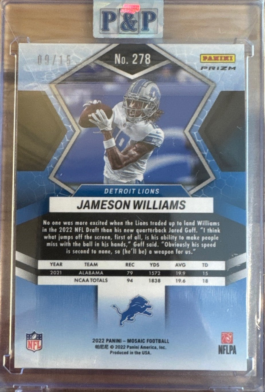 Jameson Williams is starting to figure it out as he heads into his 4th year as an NFL WR. Last year he hauled in 58 rec for 1001 yards and 7 TDs. He's been the talk of training camp with his blistering speed and crisp route running. This is a great chance to scoop a rare card of a rising player.
